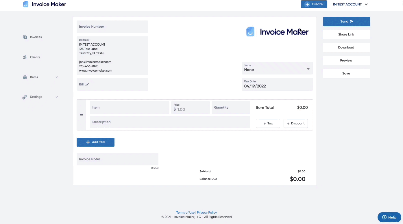 From your Invoice Maker account dashboard, you can add a discount to your invoice. Once you create a discount, you can apply it to the current invoice only or add it to your Discounts to make the discount available to any future invoices created.